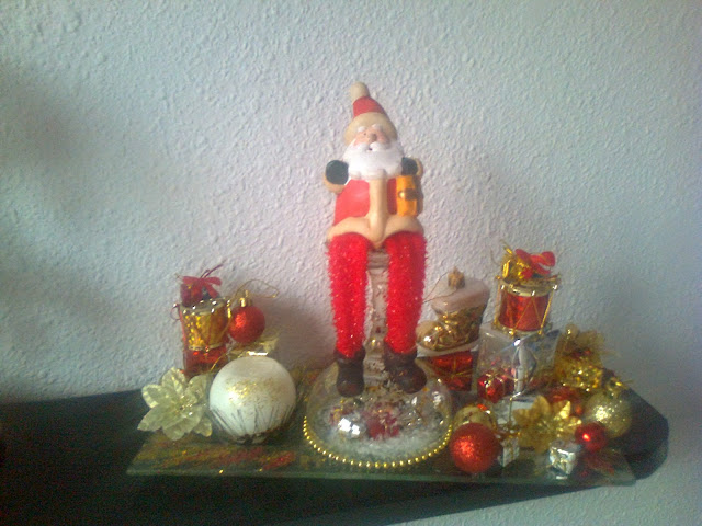 Just glasses of champagne and wine, glass saucers, glitter, a few ornaments , small round candles , glue and ...some imagination. Hope you like my idea
